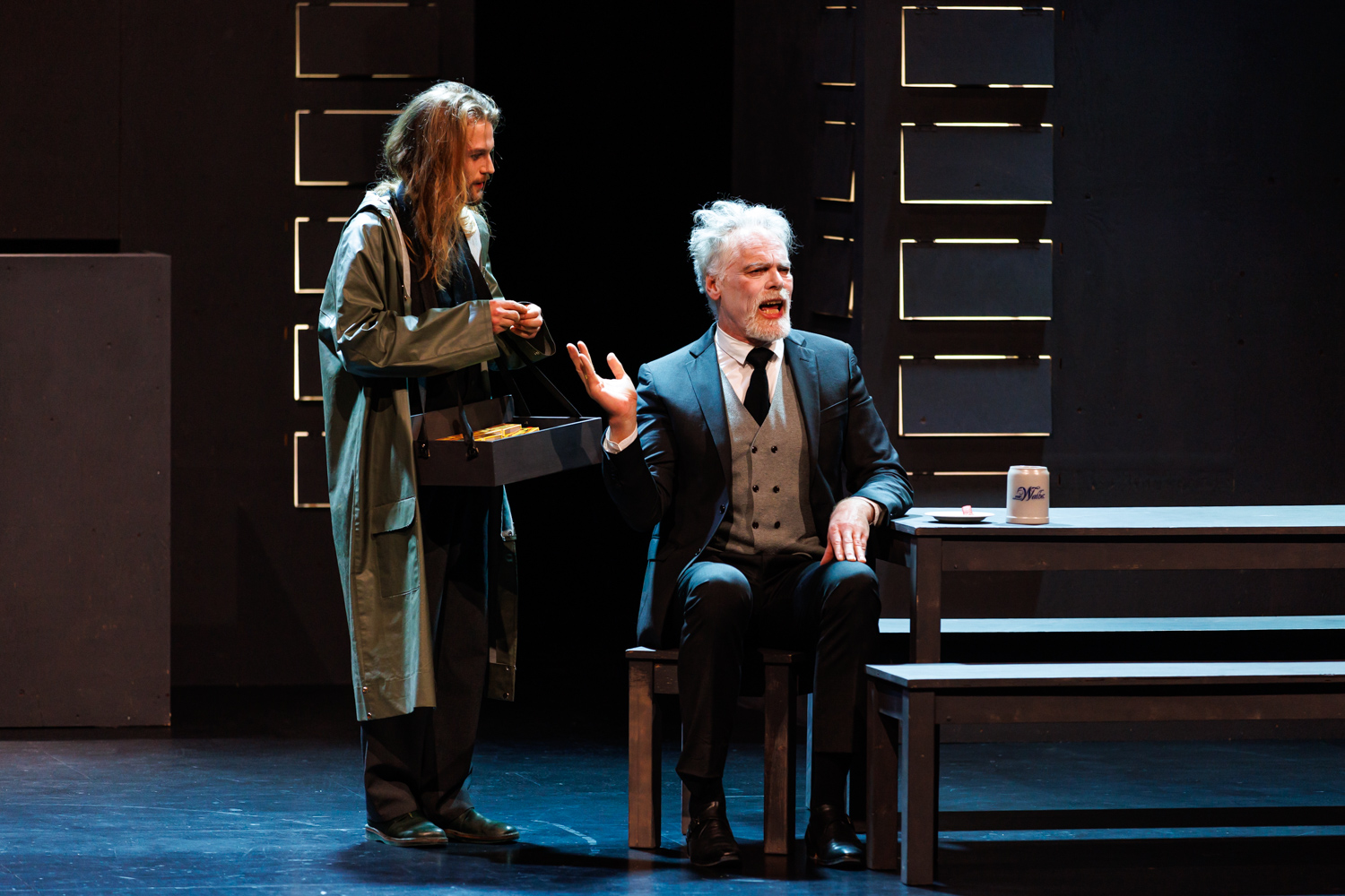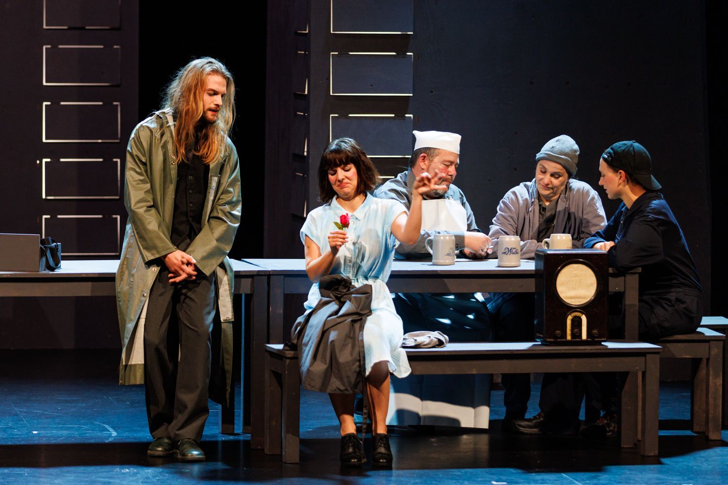 Während Adam Eva als Werkzeug für den Aufbau einer lokalen Fisch-Industrie instrumentalisieren will, weckt sie bei den Gästen allerhand Begierden. Die Ordnung des Automatenbüfetts wird auf den Kopf gestellt. Trotz Technisierung und Modernität erweist es sich als unsichere Blase, in der jeder nur seinen Vorteil sichern und seine Ängste betäuben will – sei es mit Ideologie, Opportunismus oder mit Harzer Käse.