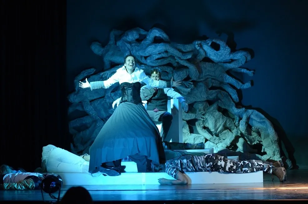 Motiviert durch seine schöne Gattin, Lady Macbeth, greift er tatsächlich blutrünstig nach dem Königsthron und nach der Macht über Schottland.