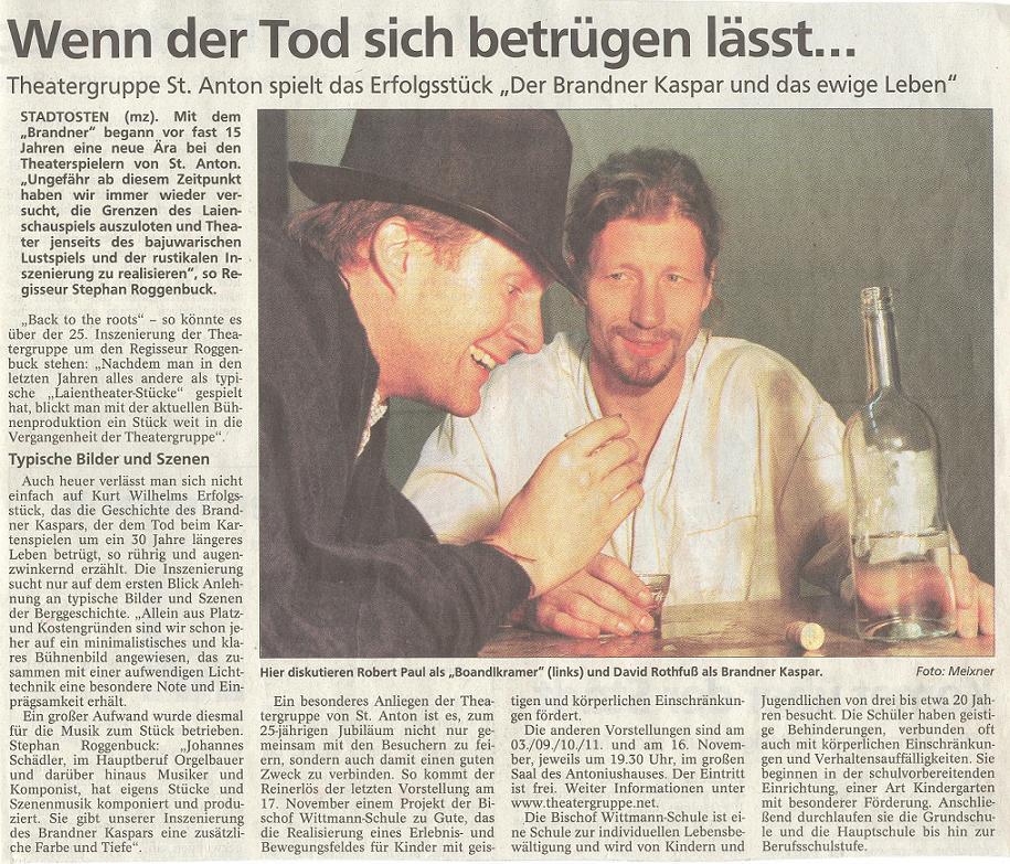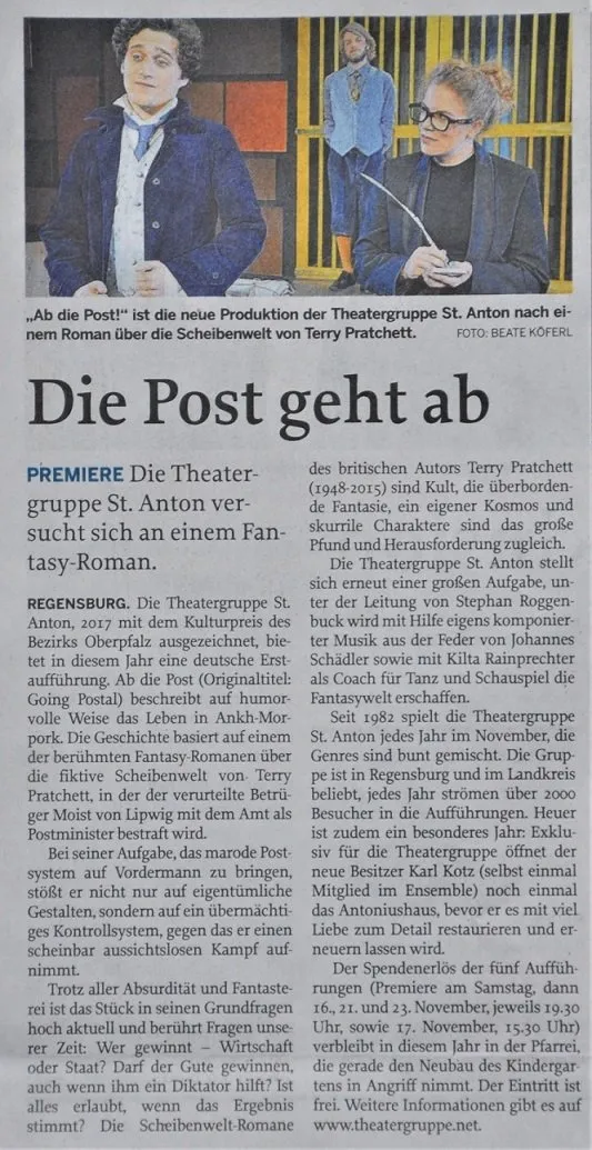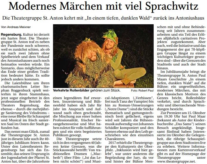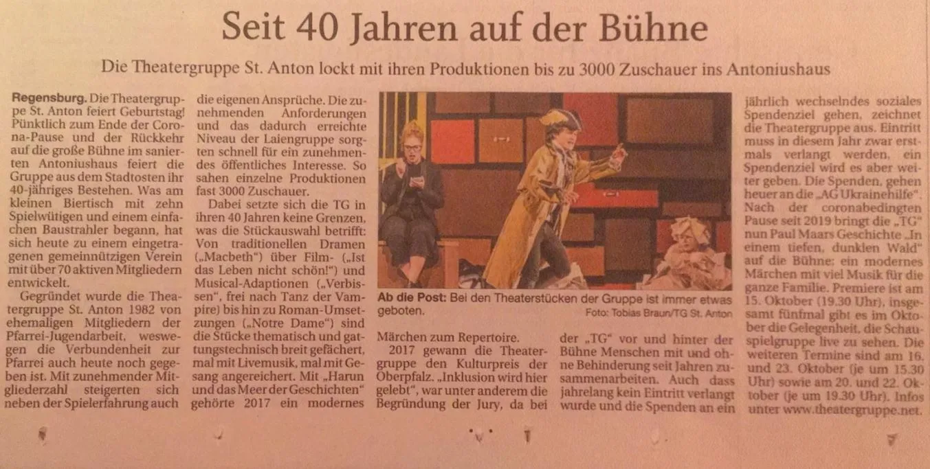 Gegründet wurde die Theatergruppe St. Anton – kurz und liebevoll TG – im Jahr 1982 von ehemaligen Mitgliedern der Pfarrei-Jugendarbeit. Was am Biertisch mit zehn Spielwütigen und mit einem Baustrahler im Pfarrsaal begann, hat sich heute zu einem eingetragenen Verein mit über 70 aktiven Mitgliedern entwickelt, die vor, auf und hinter der Bühne mit Herzblut jährlich eine neue Produktion auf die Beine stellen. In den nun gut 40 Jahren sind auch die technischen Möglichkeiten und das Repertoire an Stücken stetig angewachsen. Was gleichgeblieben ist, und was alle Mitglieder der TG eint, ist die Freude am Schaffen und daran, gemeinsam einer Idee Leben einzuhauchen. Jahr für Jahr wieder!